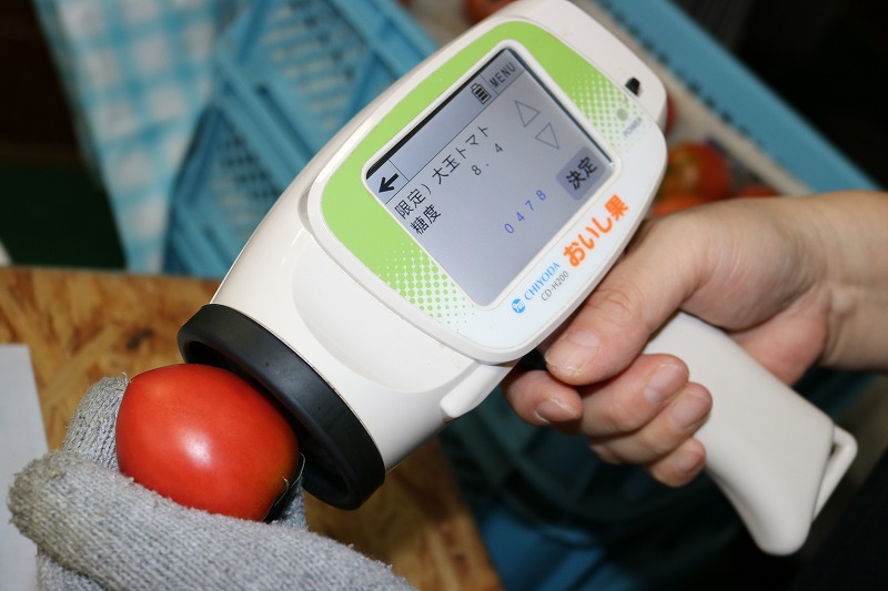 スーパーに並んでいるトマトの糖度は大体4~5ですが、もりゑ産直は甘くておいしいトマトの生産にこだわっています。